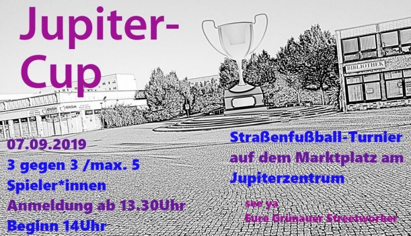 Am kommenden Samstag, 7. September bauen wir auf dem Marktplatz am Jupiterzentrum wieder den Streetsoccer-Käfig auf - und laden euch zum Jupiter-Cup ein. Es wird also richtiger Straßenfußball für Jugendliche von ca. 12-20 Jahren. Die Anmeldung beginnt dort um 13:30 Uhr, das Turnier startet 14 Uhr.
